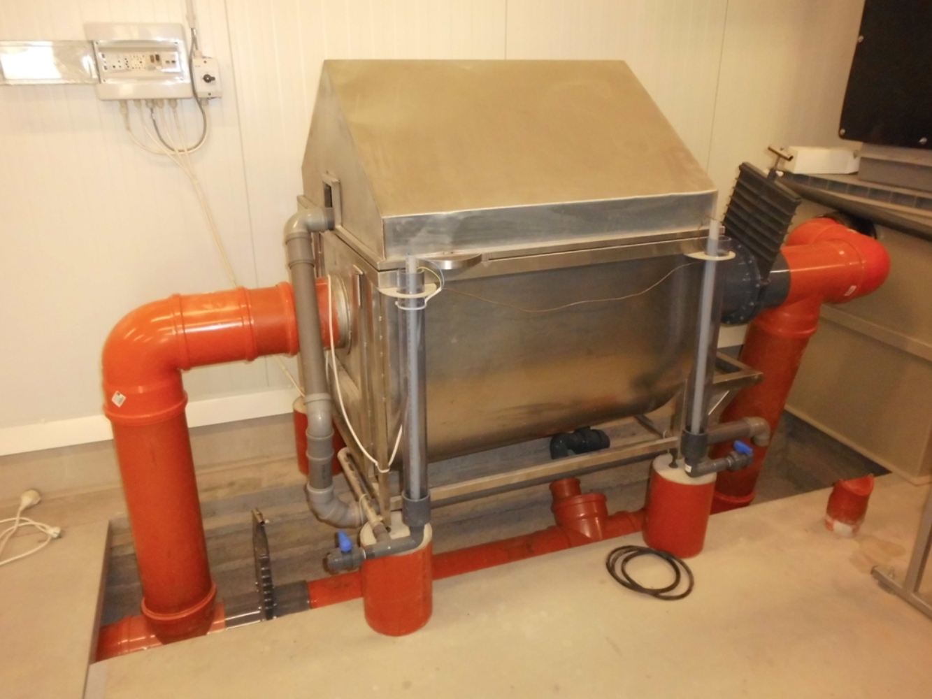 Rozsdamentes acél dobszűrő 90 köbméter/óra átfolyáshoz SEW villanymotoros lánchajtással és Grundfos mosószivattyúval, automatikával - árajánlat érdeklődésre