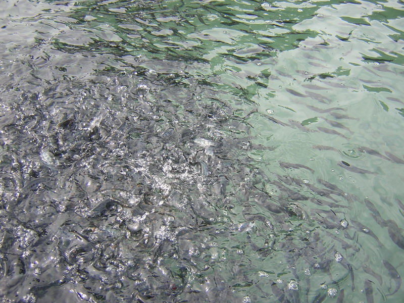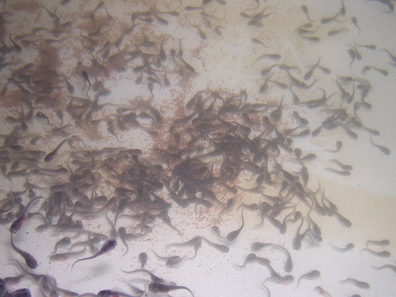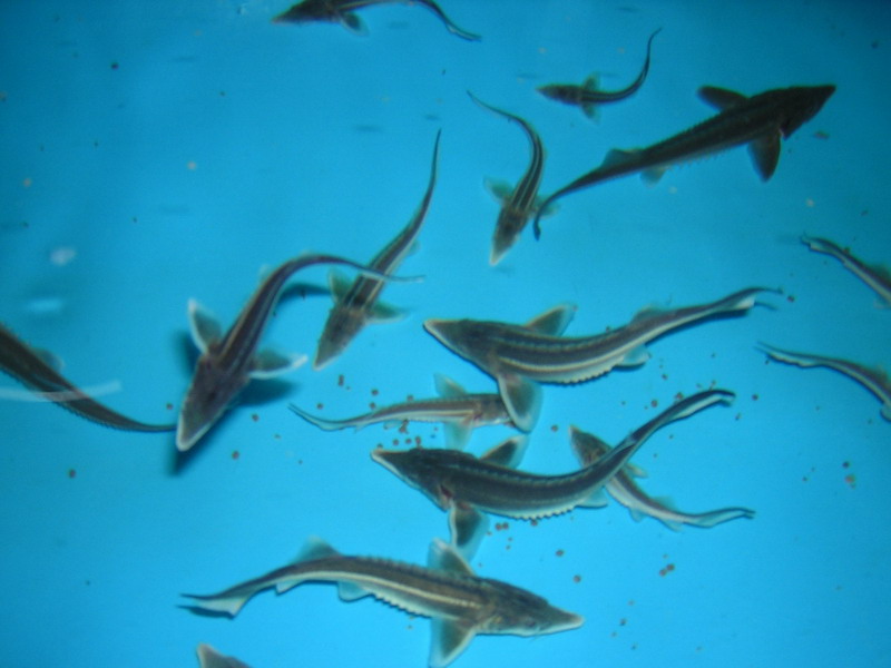 5-8 centiméteres lénai tok (Acipenser baeri) és kecsege (Acipenser ruthenus) ivadékok etetése Perla AA 0 táppal (Fotó: Bódis Márk )