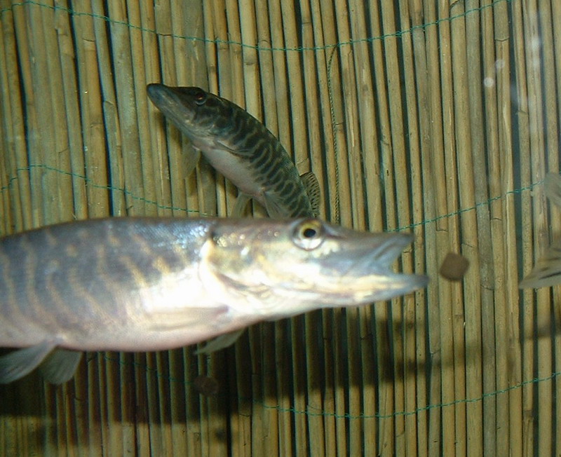 Egy csuka (Esox lucius), amint egy 6 mm-es tápszemcsét (Active 3rd P) kap el (Fotó: Kucska Balázs)